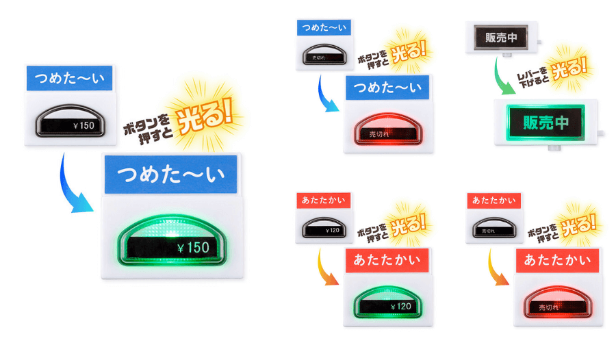 ボタンは押すと光り、販売中プレートはレバーを下げると光ります。背面にマグネットがついているので冷蔵庫などに貼り付けられます。
