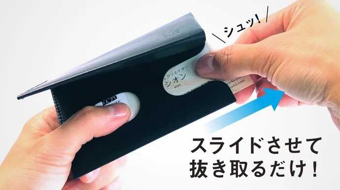 一方で、スライドサムは親指を切り込みに沿ってスライドするだけで、すぐに名刺が出てきます。