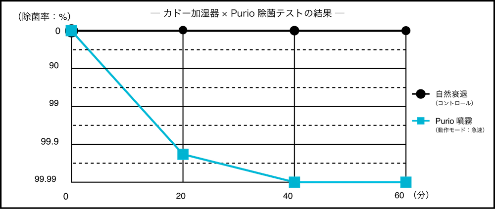 cado専用の除菌液「Purio」を加湿器で噴霧することで、6畳相当の空間において浮遊菌をわずか20分で99.9%以上除去。※2